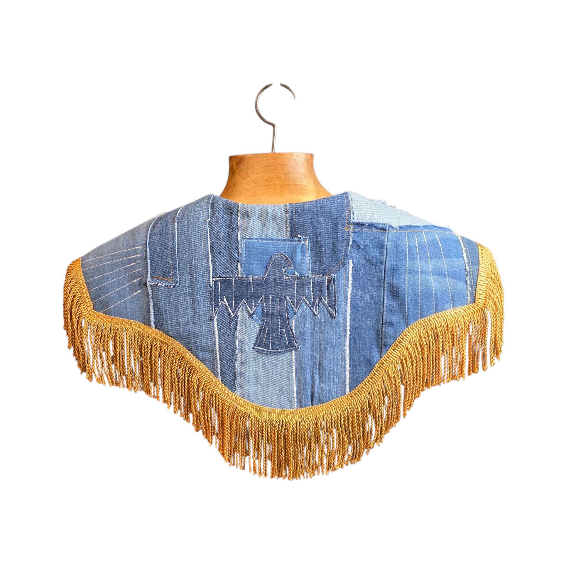 Across the back, a bold Thunderbird appliqué anchors the design — a timeless symbol of strength, resilience, and protection — set against vertical denim striping that highlights the stitchwork and texture. The capelet is lined in a vintage rose-printed flax-cotton, adding softness and subtle romance inside.